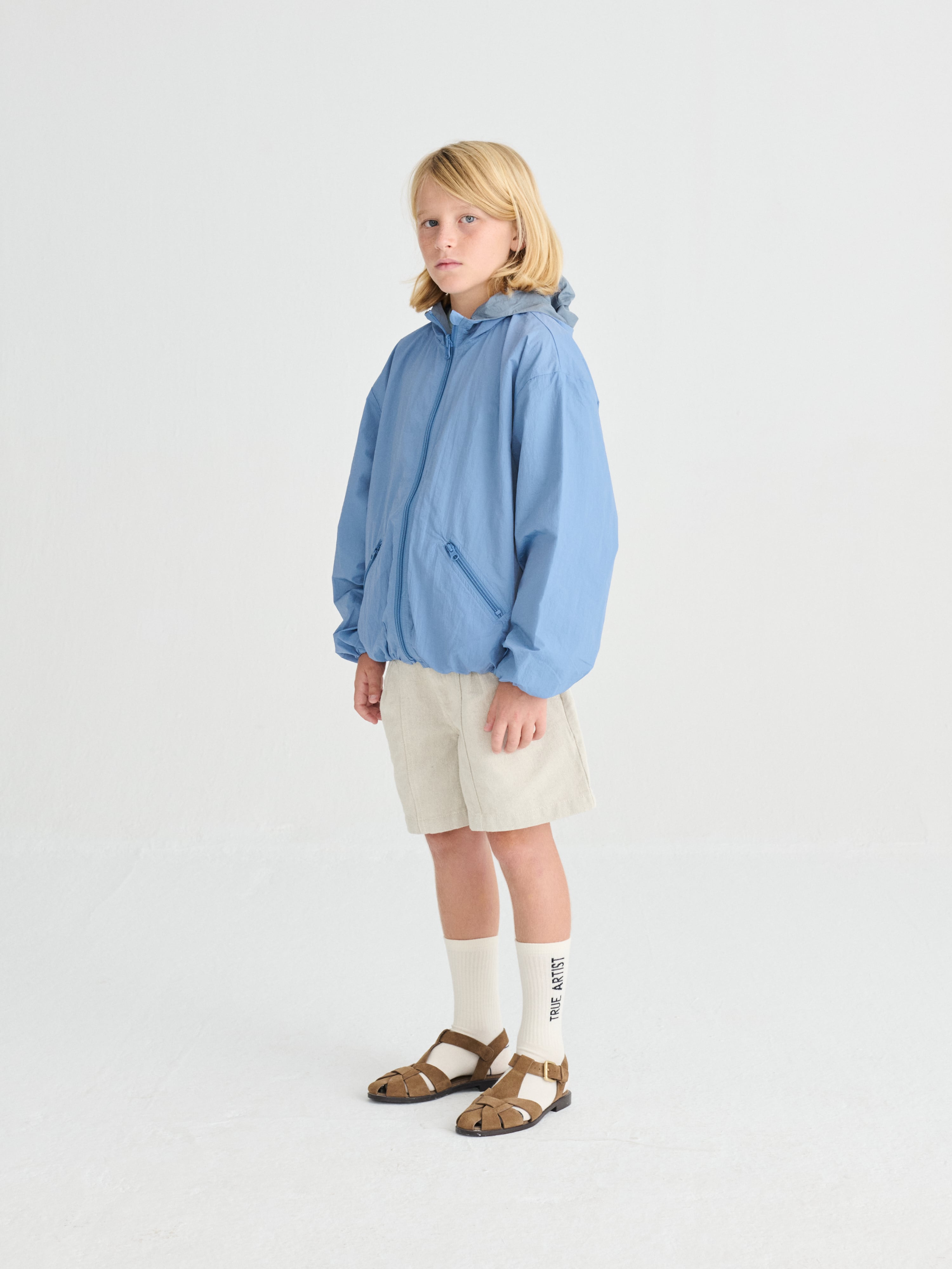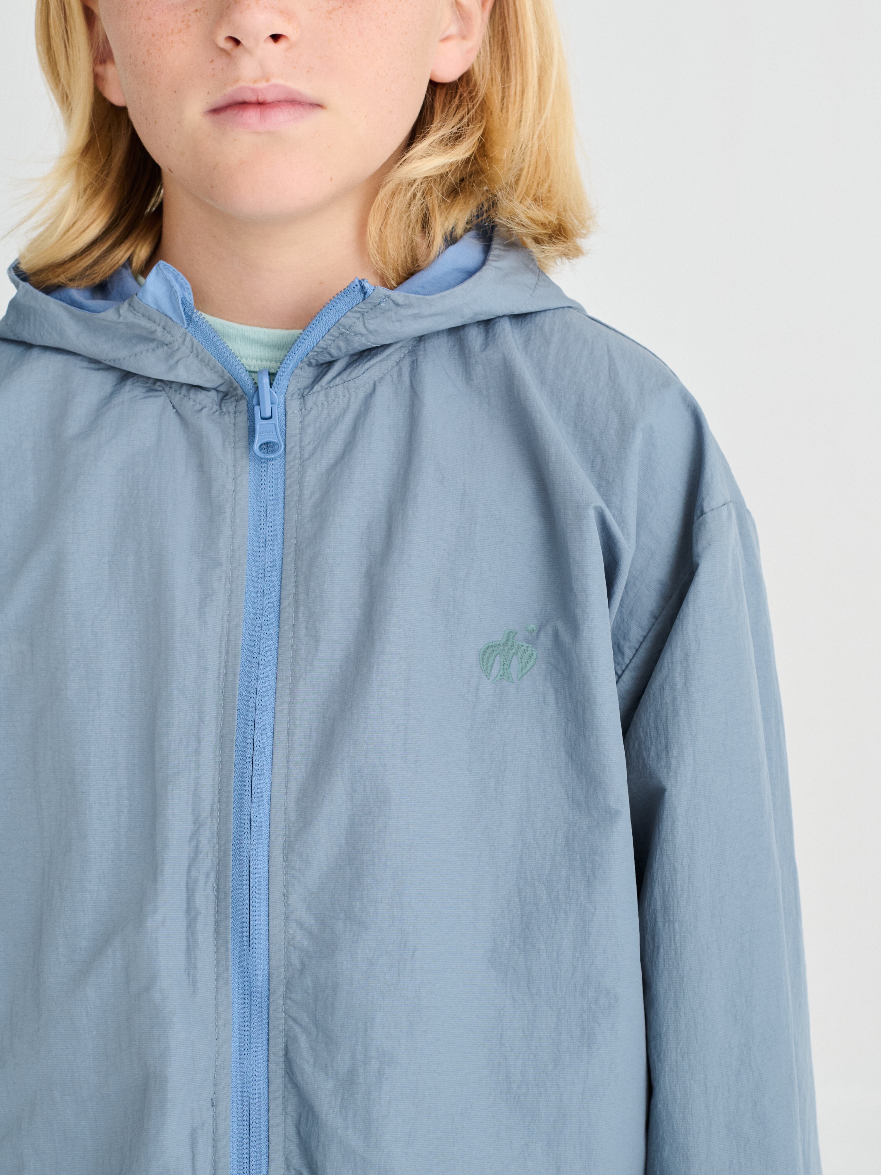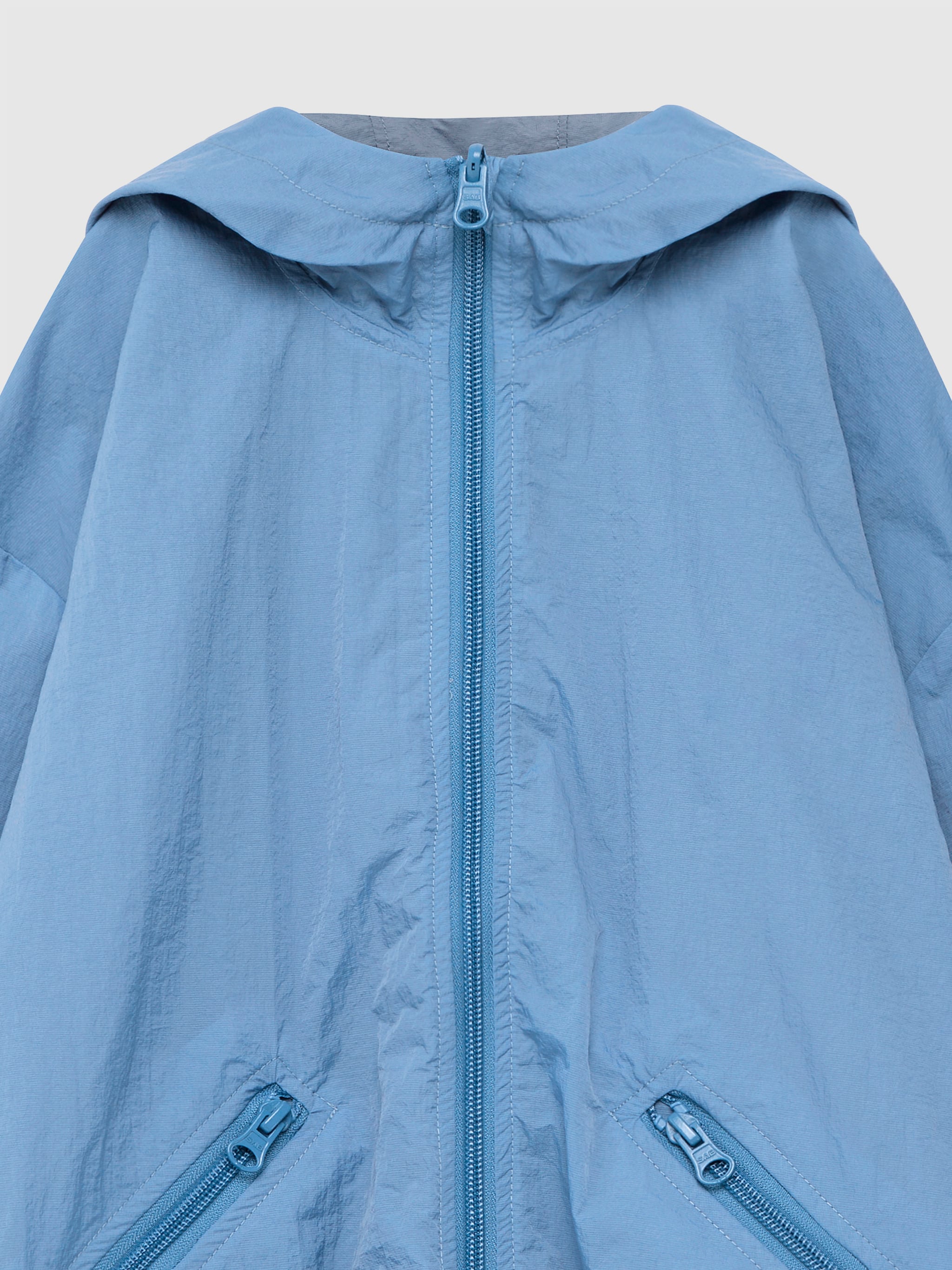リバーシブルウィンドブレーカーNo.02(カンパニュラ)は、100%ポリアミド製です。フード付きの軽量ジャケットで、フロントジッパー開閉、外側のサイドポケットにもジッパー、裾と袖口は伸縮性を備えています。ジャケットの両サイドにブランドのディテールが施されています。ゆったりとしたフィット感です。中国製。