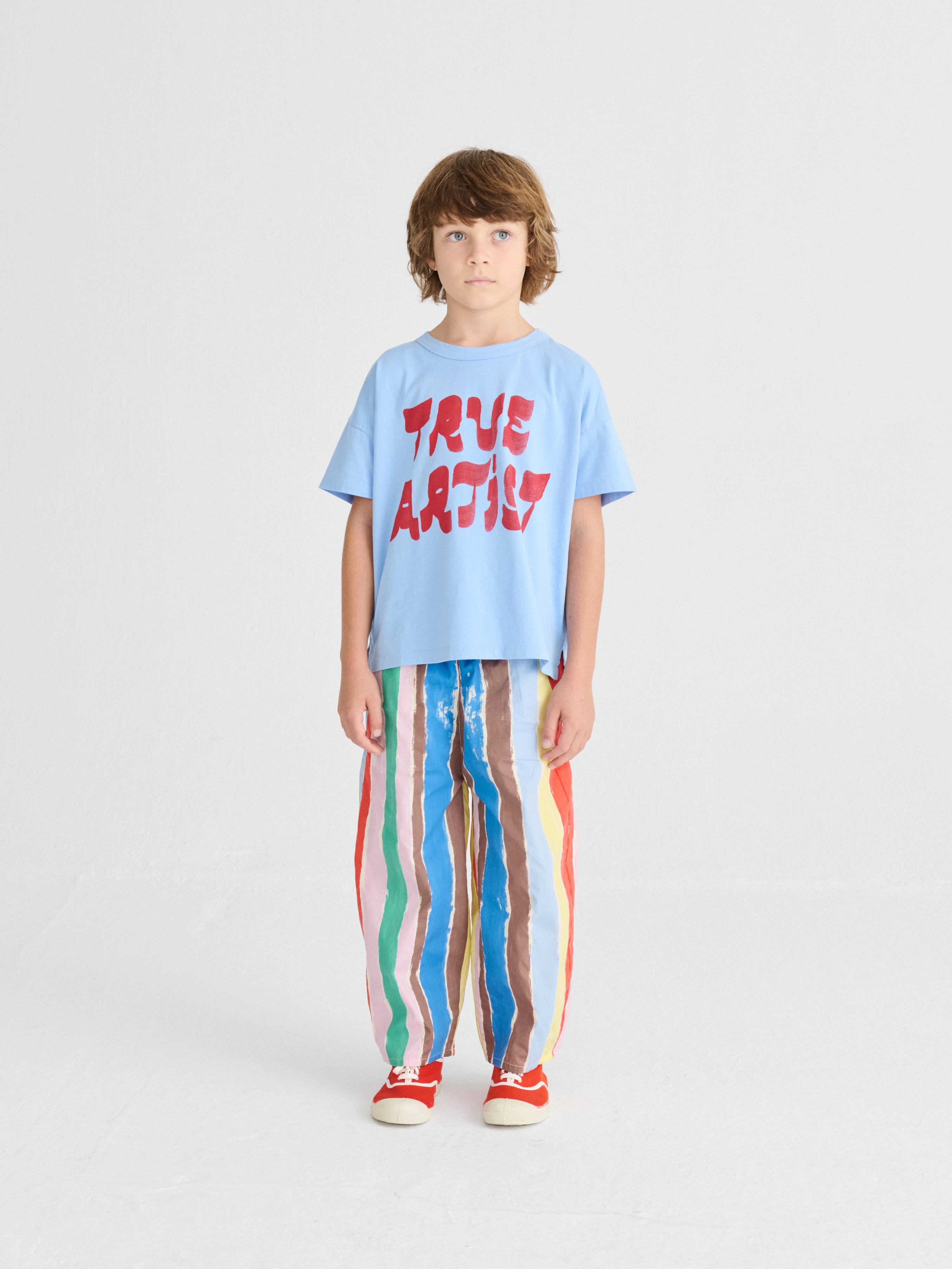 スカイライドブルーのTシャツ No.01は、オーガニックコットン100%製で、フロントには季節感あふれる「True Artist」プリントが施されています。ドロップショルダー、ラウンドネック、半袖のデザインで、ボックスフィットです。ポルトガル製。