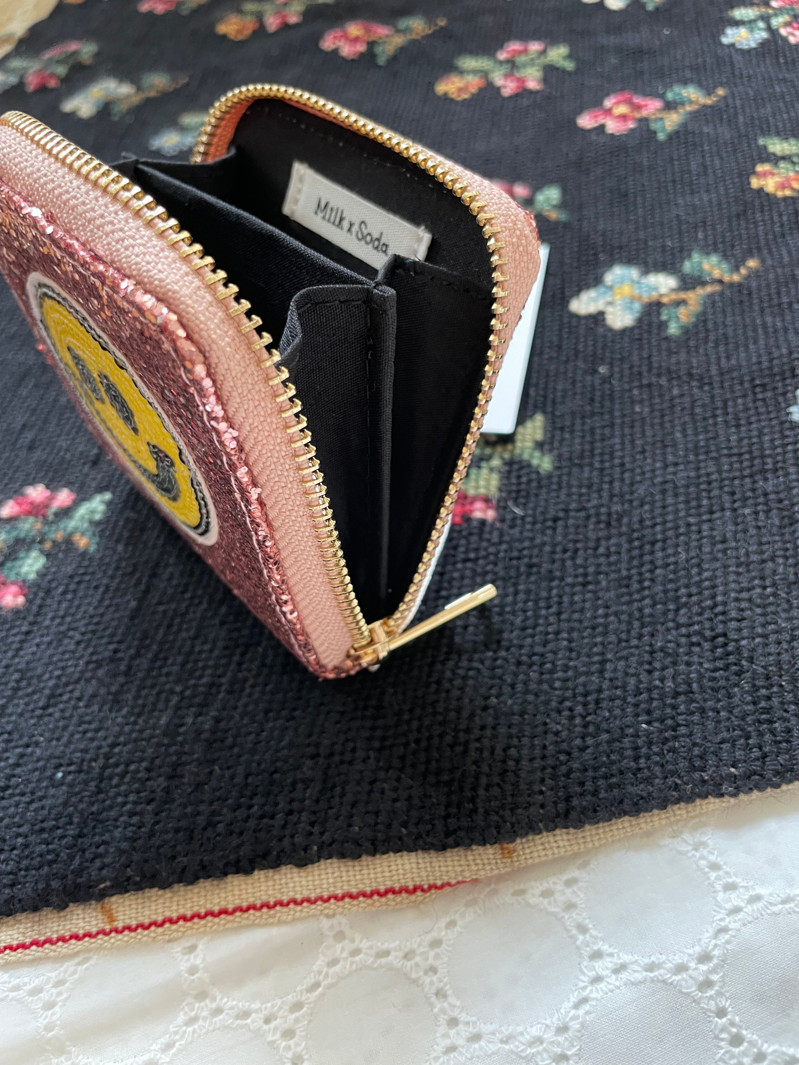 スパンコールのモチーフが付いたグリッターラメのお財布です。小さなバッグにも入れやすいミニサイズ!